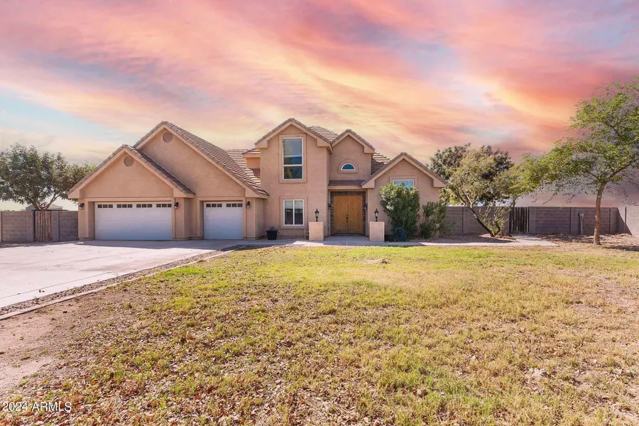 HIDDEN OASIS! AN ABSOLUTE MUST-SEE ONE-OF-A-KIND HORSE PROPERTY that is fully fenced with block wall & gated with a Stunning 2-story SEMI-CUSTOM HOME with NO HOA! 1.27-acre lot. 3 Car Garage Slate flooring, Granite countertops in kitchen, laundry room, & bathroom vanities. Custom hickory wood cabinets & soaring vaulted ceilings. FLEX Room & Master bedroom on main floor with 2 bedrooms upstairs. Master bedroom bath has granite double sinks, separate tub from shower. Large walk-in Closet in Master with vaulted ceilings. Guest bath is off the dining area. Full Bath upstairs. Dual AC Units. Huge backyard with beautiful mature trees. Enjoy the stunning Arizona Sunsets from your large, covered patio. Recently added a separated spacious horse area with 4 stalls and an enclosed tack/feed shed. Appliances included Refrigerator, Built-in dishwasher, Microwave, & Washer & Dryer. Huge unfinished roo...