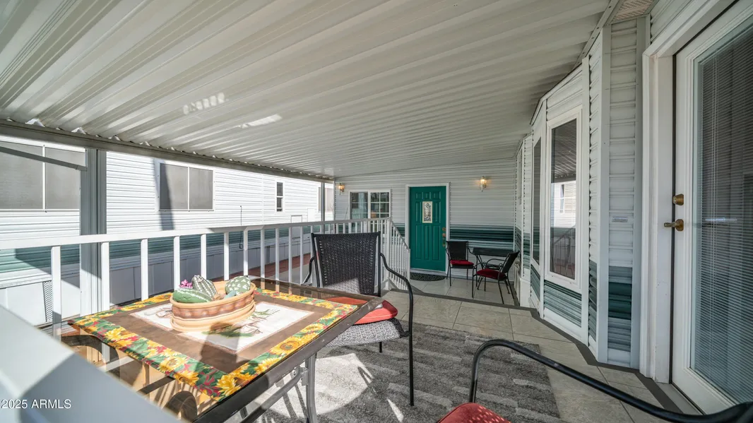 OWN THE LAND & ENJOY RESORT-STYLE LIVING! This incredible home is located in a highly sought-after community where you OWN YOUR LAND and have access to limitless activities year-round! Designed for both indoor comfort and outdoor enjoyment, this home offers a perfectly balanced layout with thoughtful upgrades throughout. Step inside through the UPDATED PATIO FRENCH DOORS with built-in blinds and side openings ($2,800 upgrade), seamlessly blending indoor and outdoor living. DOUBLE-PANED WINDOWS provide energy efficiency, while the WOOD-LOOK LAMINATE FLOORING flows beautifully throughout the park model side of the home. The OPEN U-SHAPED KITCHEN is designed for functionality, offering ample countertop space, a pantry, and generous storage. A SKYLIGHT bathes the space in natural light, creating a bright and welcoming atmosphere. The BEDROOM maximizes storage with a LIFT-AND-STORE BED, BUILT-IN DRESSER, and MIRRORED CLOSET DOORS, offering both convenience and style. The UPDATED MAIN BATHROOM features MODERN WOOD-LOOK FLOORING, a SKYLIGHT, and a CONVERTED WALK-IN CORNER SHOWER for added comfort and space. The ATTACHED ARIZONA ROOM is built with METAL-STUDDED WALLS for premium quality and durability. This raised Arizona room adds valuable extra living spaceperfect as a second living area or private guest retreat. It even includes a SECOND HALF BATHROOM WITH STACKED WASHER/DRYER, and ADDITIONAL DEEP CLOSETS for even more storage! Outdoors, relax on the COVERED, TILED PATIO, which offers TWO SEPARATE SEATING AREAS to enjoy Arizona's beautiful winter weather. PULL-OUT STORAGE DRAWERS UNDER THE DECK provide the perfect spot for golf clubs, tools, and outdoor essentials. When you're not soaking in the beauty of this stunning property, step outside and immerse yourself in the AMAZING RESORT AMENITIESincluding softball, bowling, hiking clubs, ceramics, stained glass, cards, bingo, and so much more! Don't miss this incredible opportunity to own in one of the best 55+ communities!