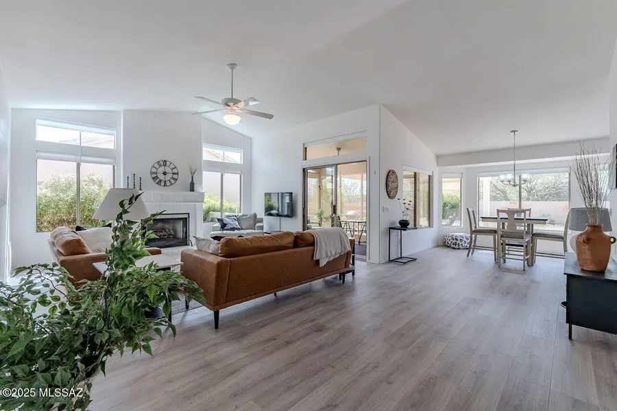 Abundant natural light fills every corner of this elegant Sonora floorplan connecting the open living, dining and kitchen areas. Spacious 2 bedrooms/2 baths. Beautifully renovated kitchen features quartz counters, new cabinets, SS appliances, pantry, and washer/dryer. A spacious main bedroom suite has a custom closet, seating area, quartz vanity, dual sinks, and walk-in shower. Gorgeous new Pergo flooring throughout, new interior paint, new push-up blinds, new fans and lights, new hardware, and cozy gas fireplace in the great room. The Arizona Room is ideal for eating, reading, or just relaxing. Enjoy the Pergola for shaded napping or outdoor time. The perfect backyard adjoins natural open space and lush trees for maximum privacy. Gorgeous home fully furnished at no cost to buyer.