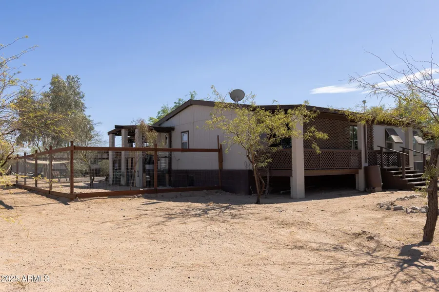 Don't miss your chance to own this rare gem - spacious 2004 Palm Harbor home tucked away on over one acre, with privacy and serene desert living. Open, revitalized interior (2022) Step inside from your covered deck into an open-concept layout featuring gray plank tile flooring and vaulted ceilings. Modern kitchen upgrades - cook and entertain with soft-close gray shaker cabinets paired with quartz countertops. Convenient laundry and family space - The thoughtfully engineered flow places the laundry just off the kitchen, and the adjoining eat-in kitchen and family room are ideal for gatherings. Primary suite with its own patio access, walk-in closet and 3/4 bath. Versatile Extra Bedrooms - A large 2nd bedroom plus a third room used as a bedroom.