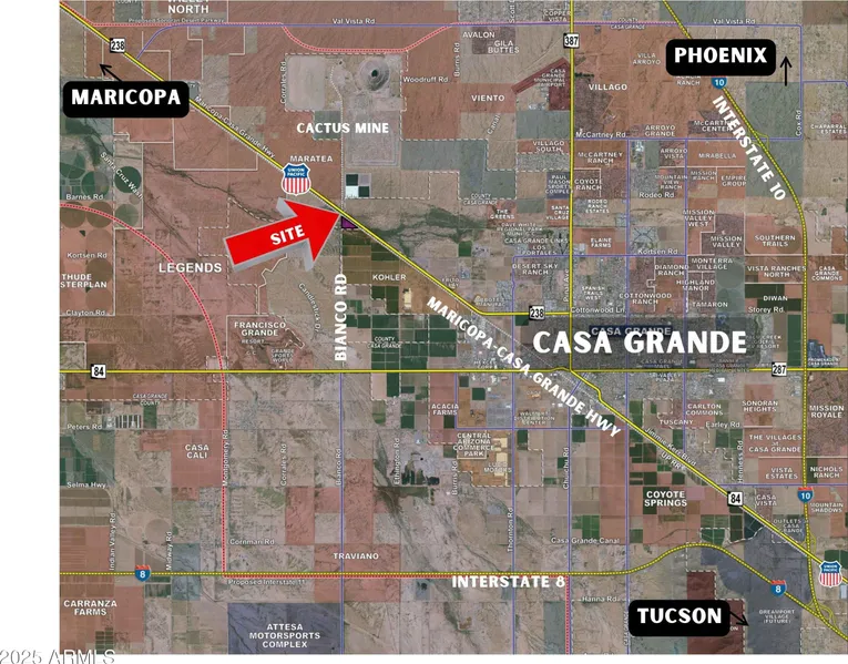 Unique 22 acre Heavy Industrial zoned parcel (I-3, Pinal County island) near new NRS Semiconductor Logistics & Kohler plants in high-growth Casa Grande industrial corridor. Perfect for contractor's yards, materials / container storage, broad I-3 approved uses. Hot industrial-zoned land for less than $1/SF! Establish mini industrial park and sell or lease. Site survey and prelim. plat for 5-parcel split available. Electric (SCIP) at property line. AZ Water Co and City of Casa Grande sewer within 1/2 mile. 35 GPM well also pre-approved by ADWR. Flood Zone A, some building restrictions apply. Improved site access with new low-flow crossing on Bianco Rd now complete over Santa Cruz wash. Site has 2000 ft Maricopa-Casa Grande highway & RR frontage / visibility (no access). Priced to sell.