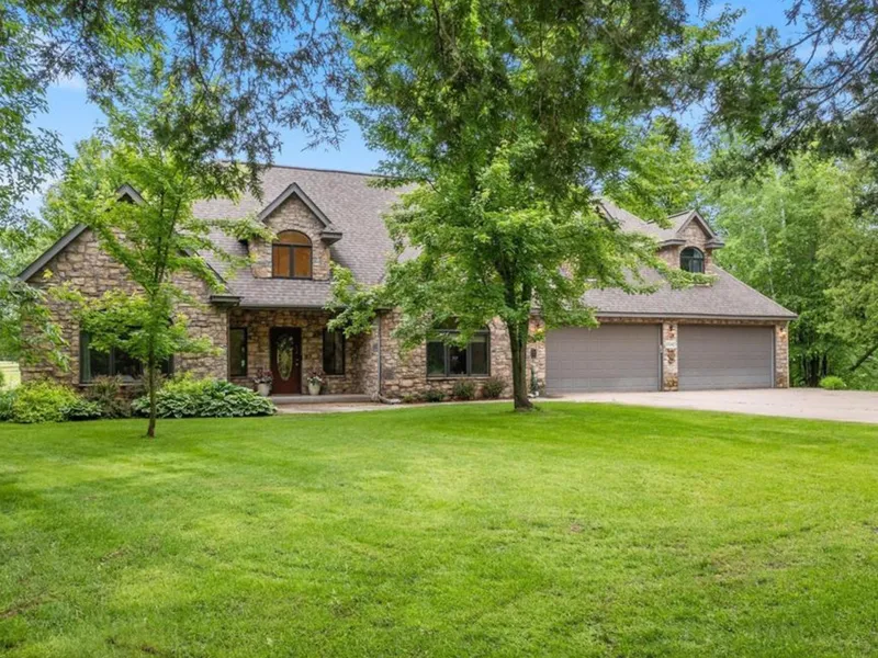 Featuring granite finishes, ceramic arches, and multiple patios. Single level with a bonus guest suite located above a 5-car garage with a private entrance. The 4-bedroom property offers sunset views and is located near a public boat launch, providing access to over 3,000 acres of boating on Cross Lake, with connections to Pokegama via the Snake River. Includes features such as cherry cabinetry, granite countertops, 8' doors, race track ceiling in the formal dining room, in-floor heat, knotty pine porch with wet bar, gas fireplace, whirlpool tub, built-ins, and a large heated 5-car garage. Bonus room above garage functions as a third bedroom.