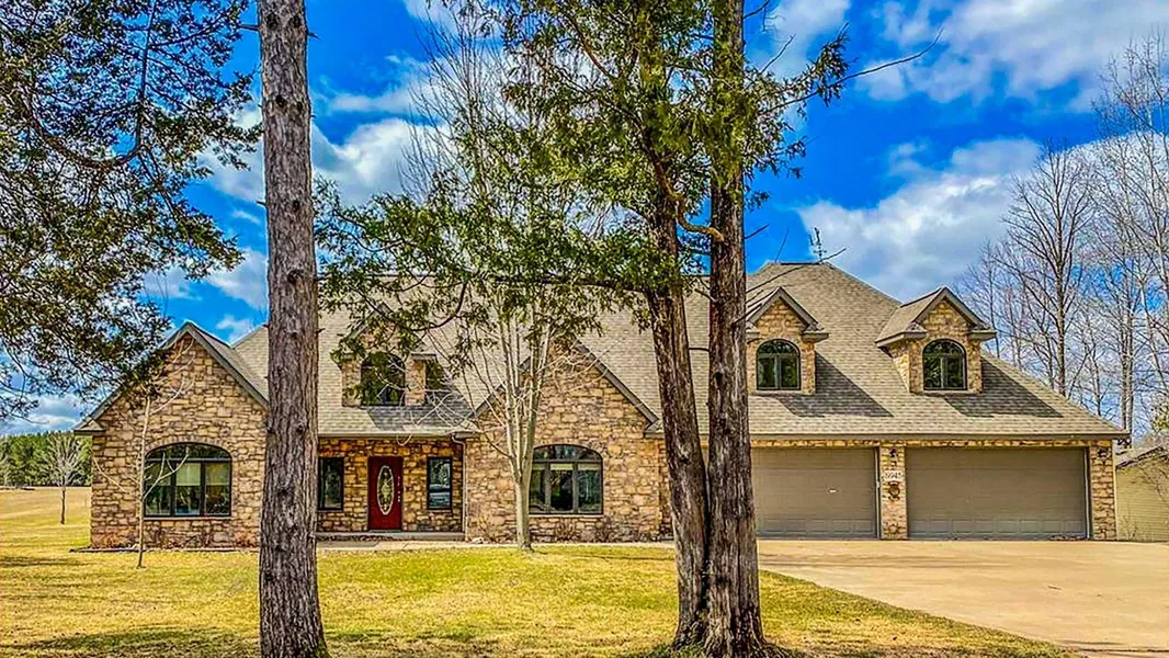 Featuring granite finishes, ceramic arches, and multiple patios. Single level with a bonus guest suite located above a 5-car garage with a private entrance. The 4-bedroom property offers sunset views and is located near a public boat launch, providing access to over 3,000 acres of boating on Cross Lake, with connections to Pokegama via the Snake River. Includes features such as cherry cabinetry, granite countertops, 8' doors, race track ceiling in the formal dining room, in-floor heat, knotty pine porch with wet bar, gas fireplace, whirlpool tub, built-ins, and a large heated 5-car garage. Bonus room above garage functions as a third bedroom.