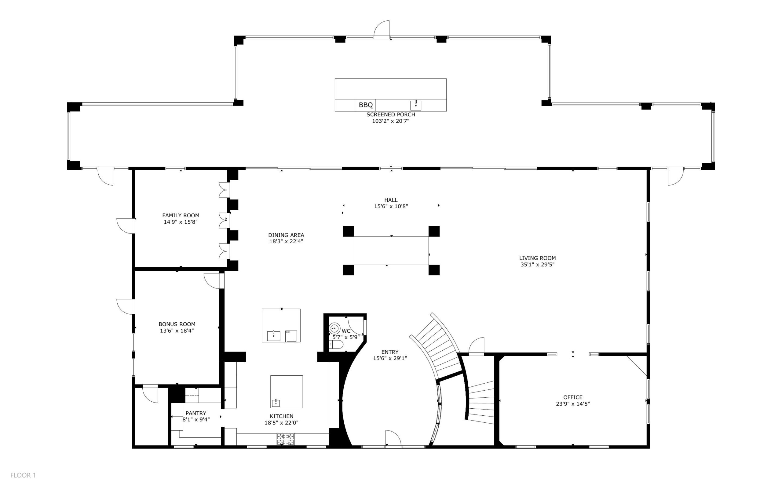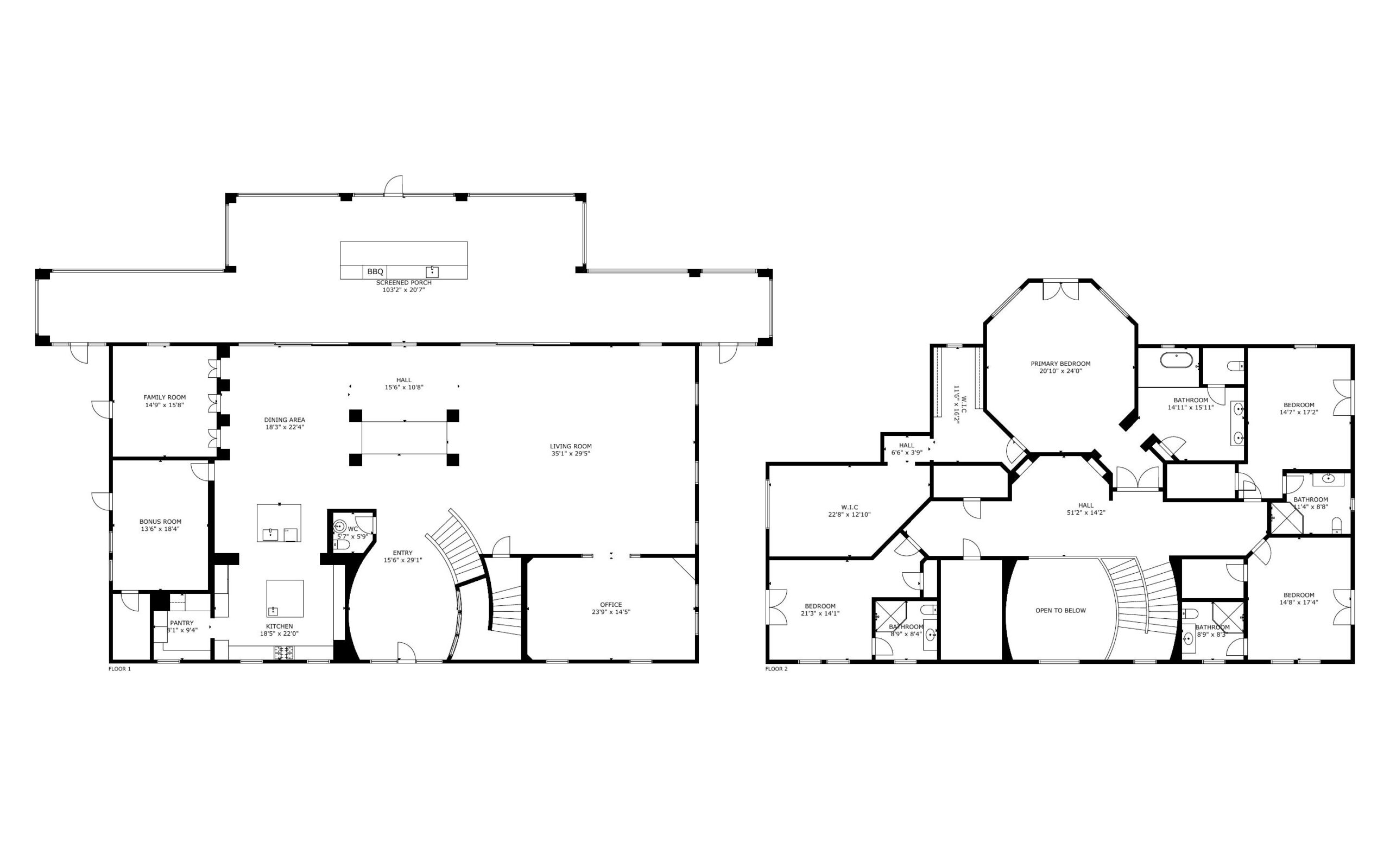 The main residence at Serella Stables is a custom architectural statementcrafted with the timeless grace of a Southern estate and the substance of a modern luxury home. Spanning approximately 7,800 square feet, the home showcases a refined blend of natural materials and artisan detail. Wide-plank hardwood floors, reclaimed wood beams, custom cabinetry, and natural stone accents create a warm, sophisticated atmosphere throughout.Walking into the grand two-story entry you’ll find a circular staircase, a glass wall showcasing the wine cellar, and an impressive 1400 gallon saltwater aquarium, which is the anchoring centerpiece visible from multiple rooms. From the entry you will be awed by the Aspen-lodge-inspired main living area, which has beautifully crafted tongue-and-groove ceilings, exposed beams, industrial hardware detailing and stone architectural columns, all adding depth and character to this warm rustic ambiance. French doors lead into a private study with ample natural light and a steel safe. A vault-style door provides a dramatic entrance to the walk-down wine cellar with exposed brick and wood giving off Old World charm. The guest bath has a steampunk-inspired pedestal sink crafted from industrial copper piping and riveted hardware.