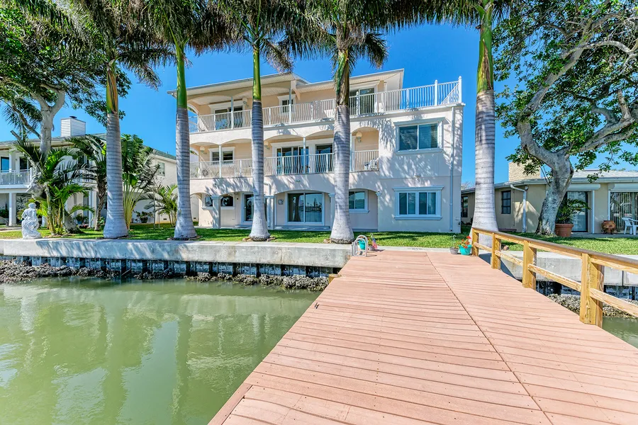 Discover your sanctuary in Redington Shores, a community where the charm of local living is preserved by prohibiting short-term rentals. This elegant, custom-built, three-story home offers breathtaking waterfront views and private beach access, reflecting a blend of luxury and tranquility. Meticulously maintained by a single owner, this property stands as a testament to quality and care. The residence is beautifully framed by towering royal palms at its waterfront edge, providing 68 feet of direct waterfront access. These palms not only enhance privacy but also create a picturesque setting for potential enhancements like a pool or spa. The expansive deck, equipped with a tiki top, offers a serene space for relaxation and enjoying the waterfront lifestyle. Internally, the home spans three levels, with main floor embracing an open-concept design. This area includes a kitchen that seamlessly connects to the living and dining spaces, fostering a cohesive atmosphere for gatherings. The kitchen is equipped with a closet system for plenty of storage, alongside granite countertops and high-end LG appliances. Hurricane-resistant windows and doors throughout the home ensure safety while maximizing the stunning views. The upper levels boast spacious balconies that extend the living space outdoors, paired with sweeping views. On the top floor, a unique wraparound balcony, accessible from each bedroom, offers panoramic views that deepen the connection to the natural surroundings and waterfront. On Boca Ciega Bay, the property serves as a prime spot for watching maritime activities and encountering wildlife, such as dolphins and manatees, enhancing its charm. This design thoughtfully blends indoor comfort with the allure of the outdoors, allowing for personal enjoyment of the area's serene beauty and vibrant marine life. Recent updates include a new roof in 2023 and the replacement of A/C units between 2009 and 2015, highlighting the home's impeccable maintenance. Its proximity to dining, parks, and beaches combines the appeal of waterfront living with convenient access to amenities, fostering a sense of community. This property is more than a home. It's a retreat for those seeking a blend of luxury, privacy, and engagement with the natural surroundings, in a vibrant community setting. The integration of royal palms and extensive balconies brings the beauty of Redington Shores into everyday living, complemented by a deck designed for ultimate relaxation. This home invites you to experience the best of Florida living in a serene and picturesque environment.