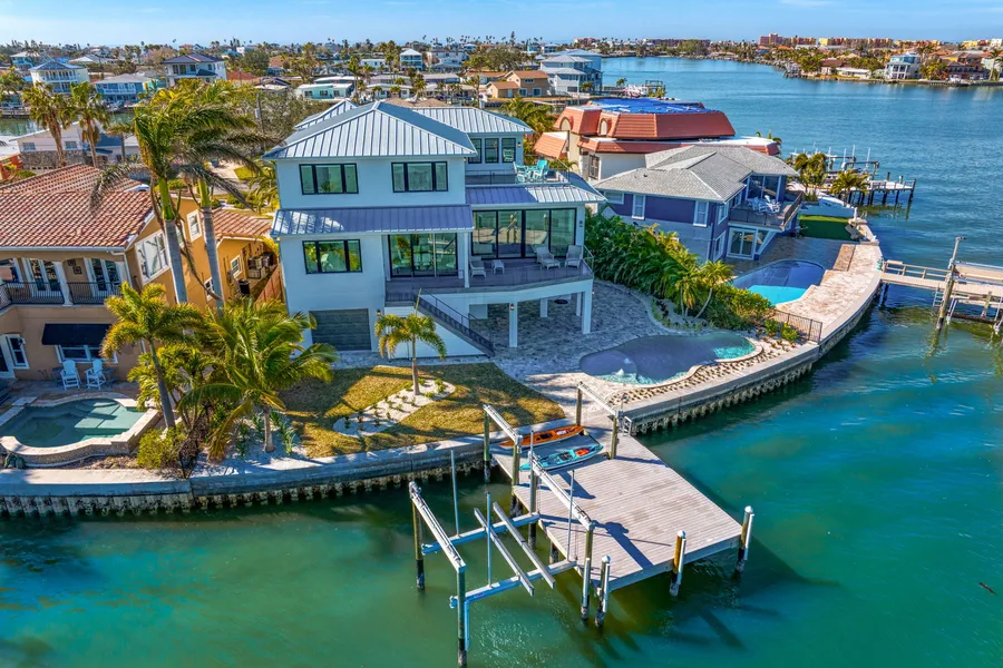 Exquisite Designer Waterfront Home – Experience the pinnacle of luxury waterfront living in this Inspiration Development Signature Home, a designer residence set on an incredible point lot with 103 feet of waterfront. Spanning over 6500 sq. ft. total, with 4180 sq. ft. of A/C living space, this stunning home features two primary suites, two guest bedrooms, five bathrooms, a six-car garage and elevator. This home is move-in ready, blending sophisticated style with exceptional comfort. The great room impresses with soaring ceilings and a 10-ft wall of stacking sliders, framing breathtaking open water views. The chef’s kitchen is a masterpiece. Boasting a stunning Marble prep island, custom white pecky cypress cabinetry, Monogram stainless steel appliances, and an oversized walk-in pantry. The dining area, surrounded by picture windows, offers sweeping water views and creates a unique and elegant dining experience. The main floor primary suite is a luxurious retreat with panoramic water views, his-and-her walk-in closets, and an en-suite bath featuring exquisite Marble details, dual vanities, an immersive walk-in shower, and a soaking tub. A main-floor guest room serves as a perfect home office or private suite. Take the elevator to the top floor, where a spacious family room with a wet bar opens to an expansive balcony with stunning water views. The second floor primary suite boasts 180 degree water views, an en-suite bath, and a generous walk-in closet, while an additional guest suite offers comfort and privacy. Step outside to your resort-style backyard, featuring a covered lanai, freeform pool, travertine decking, and a composite dock with electric and water hookups. The dock features a 20,000lb boat lift and 10,000lb kayak lift and launch. As a boating enthusiast, you will love being able to walk out of your back door, hop onto your watercraft and live the island life to its fullest. All this and just a short stroll to the white sandy shores of Redington Beach. This home was built with top-tier materials for both elegance and durability, this home includes block construction, impact windows, Icynene insulation, TPO balconies, and a metal roof. Sellers are willing to entertain a sale of furnishings in a separate transaction. This waterfront masterpiece is the epitome of Florida luxury living—schedule your private showing today!