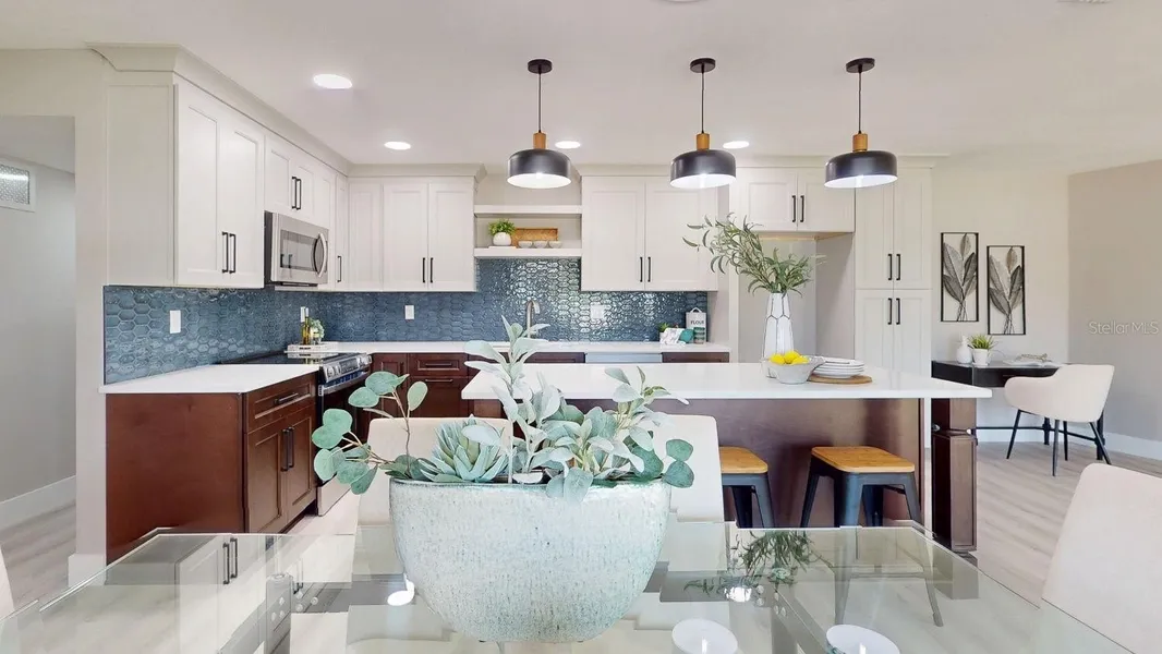 Step inside to an airy, sun-drenched open floor plan where natural light pours in and style shines throughout. The showstopping gourmet kitchen features quartz countertops, European soft-close cabinetry, an oversized island, a vibrant blue glass backsplash, and premium stainless steel appliances. Designer lighting and coastal-inspired blue accents create a high-end, cohesive feel throughout the home.