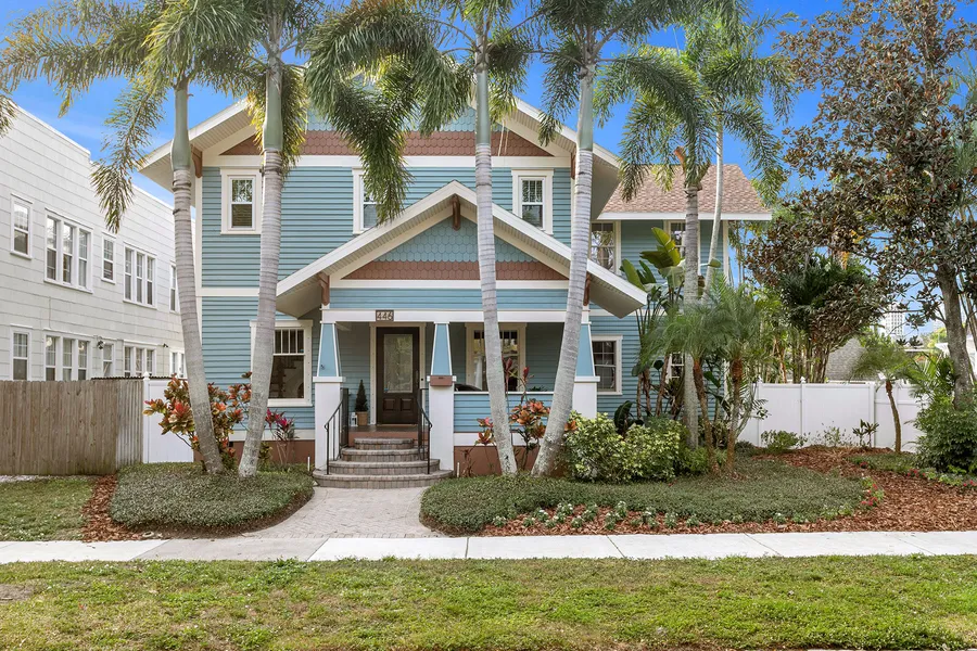Situated in the highly sought-after Historic Old Northeast, this exceptional Craftsman home blends timeless character with modern comforts. Originally built as a small bungalow in 1919, it was relocated in 2001 to its current non-flood-zone location where it was significantly expanded and modernized, providing a rare blend of historical charm along with all-new plumbing, electrical, kitchen, bathrooms, bedrooms, etc. The property includes an oversized two-story garage with a spacious studio apartment, a delightful screened-in gazebo, and a large patio surrounded by bamboo and palm trees. This private oasis is only minutes away from Tampa Bay, North Shore parks, downtown, and the Pier. A welcoming front porch leads you inside to an open living space filled with classic architectural details, including a gas fireplace with an elegant decorative mantel and black stone hearth, built-in bookshelves, crown molding, and a beautifully crafted staircase with rich cherry handrails and iron balusters. The freshly painted interior and refinished maple hardwood floors enhance the home's warmth and elegance. The spacious kitchen is a chef's delight, featuring a gas stove, expansive granite counters, and French doors that provide light and entrance to the lush, serene patio. Adjacent to the kitchen is an inviting sunroom filled with windows and additional French doors, creating a beautiful flow between indoor and outdoor spaces. The main level also offers a bedroom/office and full bathroom. Upstairs, the primary suite is a spectacular retreat, showcasing vaulted ceilings, Brazilian cherry flooring with inlaid maple, double French doors opening to a large private balcony, a connected sitting room, spa-like bathroom, and generous walk-in closet. A second upstairs bedroom also features vaulted ceilings and an ensuite full bathroom. Luxurious furnishings throughout the home and garage studio are available for purchase through separate arrangements. Additional property features include new roof (house, garage, gazebo) and solar panels, 2020; full-house generator, 2021; exterior paint, 2023; combination of hurricane impact windows/doors and Kevlar blinds, Trex wood decks, three A/C units, and an expansive parking pad.