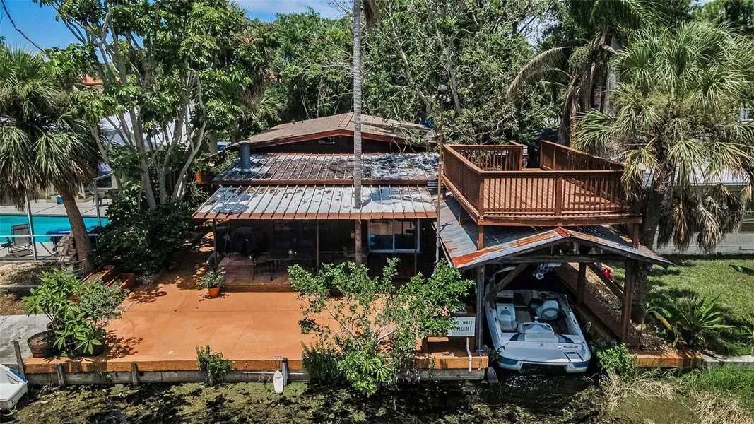 Significant Price Improvement! Experience waterfront living at its finest in this beautifully maintained 2-bedroom, 2-bathroom home along the serene canals of Palm Harbor with direct access to Lake Tarpon. Boating enthusiasts will love the private dock with a 10,000 lb. boat lift, perfect for exploring the lake or cruising to open waters. The home’s classic Florida charm is immediately apparent from the exterior, with inviting curb appeal, lush landscaping, and a welcoming covered entry. Inside, the main living area exudes warmth with exposed wood ceiling beams, while the enclosed Florida room offers tranquil canal views and a cozy wood-burning fireplace that can be connected to propane for year-round comfort. The updated kitchen features quartz countertops and stainless steel appliances, and the second bathroom has been tastefully remodeled. Additional spaces include a dedicated home office with built-in shelving and a separate indoor laundry room with patio access. Step outside to enjoy an expansive covered rear patio overlooking the canal—ideal for morning coffee, outdoor dining, or simply soaking in the peaceful waterfront setting. A covered boat slip with lift and a spacious rooftop deck above the boathouse provide exceptional outdoor living and entertaining opportunities. Recent upgrades include a brand-new roof (2025) and a newer A/C system (2023), offering peace of mind. Whether seeking a full-time residence or a weekend retreat, this home combines classic Florida charm, modern updates, and direct water access in a rare waterfront package, just minutes from beaches, dining, shopping, and entertainment.