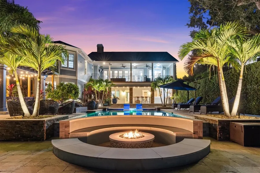 Under contract-accepting backup offers. Inspired Waterfront Living on Lake Tarpon Discover this stunning 7,682 SF estate which includes a full guest apartment on nearly one acre offering breathtaking views of the 2,500-acre Lake Tarpon. Gated for privacy, it features a private dock with 10,000-lb boat lift for sunset cruises, fishing, or kayaking, all with no HOA fees or flood insurance required. Nestled in the prestigious Palm Harbor University school zone, this move-in-ready haven combines serene lakefront allure with sophisticated luxury for discerning buyers. Over $400K invested in a "backyard nirvana" by acclaimed designer Ryan Hughes creates an unparalleled outdoor oasis: resort-style pool with ledge loungers, glistening tiled infinity-edge spa, sunken fire lounge, charming pergola, cozy moon daybed for stargazing, and dramatic custom lighting blending light, water, and fire across travertine decking amid stately grandfather oaks and vibrant tropical landscaping. The extensive covered lanai seamlessly connects to indoor spaces, ideal for gatherings, while the open floor plan greets with immediate lake views through walls of glass in the expansive family room, accented by a fireplace and decorative tray ceiling.