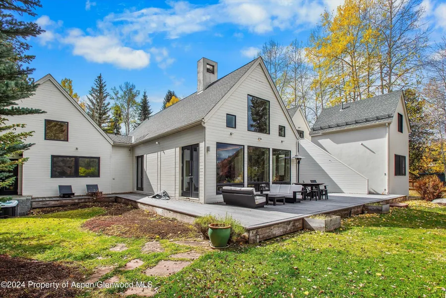 Mid-Century modern style home located on a large flat lot just minutes from downtown Aspen. This light and bright home has three ensuite bedrooms and a loft with two work stations and flex area. A separate office and mother in-law unit with kitchenette are accessed by a private entrance. The living room features a dramatic double-sided fireplace, vaulted ceilings, grand piano and easy access to the landscaped yard with hot tub. The fully equipped kitchen is open concept with breakfast bar. Relax in the private primary suite with king size bed, gas fireplace, two walk-in closets, and bathroom with steam shower, tub and sauna plus direct access to the outdoor hot tub. Located in a family friendly neighborhood with views of the surrounding mountains and close proximity to the Rio Grande Trail and the free bus route.
