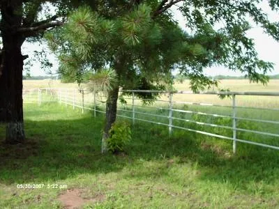 The 2 car oversized metal garage/workshop is a 20'X30" with overhead doors. Perfect for mechanic work! Situated on a concrete floor, with 220 wiring, insulation and side door entry. Behind the house is a metal barn with a tack room and the pasture is open, mostly Bermuda and native grasses. The property is fenced by a white pipe rail fence and the pasture is divided into 2 sections.