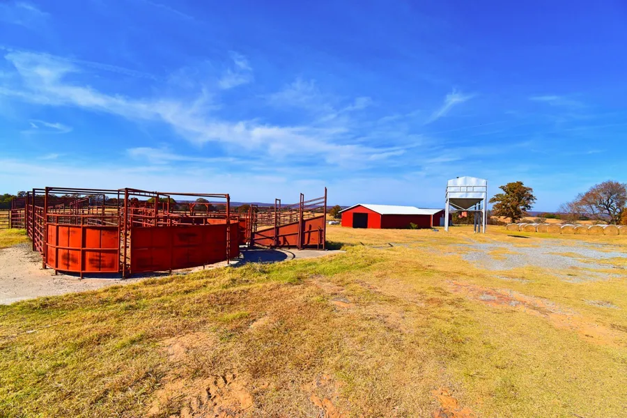 Catcher Ranch boasts an approximate land mix of 75% pasture lands with native and Bermuda grasses and 25% timbered acreage. This mix offers abundant grazing opportunity for large cattle operations and provides great diversity for a multitude of native wildlife like deer, turkeys, quail, and more to thrive. At its peak the ranch’s active cattle operation was some 270 cow/calf units with 14 bulls and it could potentially handle a larger operation. With extensive cross fencing, the property has over 10 different grazing pastures and includes 4 cattle pens that are placed strategically throughout the property. Improvements on the property include 2 barns. The first barn is a 40’x 60’ with a concrete floor and the second is a 30’x 70’ with a dirt floor. The barns total a combined 4500 sq. ft. of shop and storage space for hay, feed, tractors, implements, and other farm equipment. There is also a 40 ton feed bin, a set of Tru Test 12 volt cattle scales located near the barns, and 3 water wells in different areas around the Ranch with electric utilities.