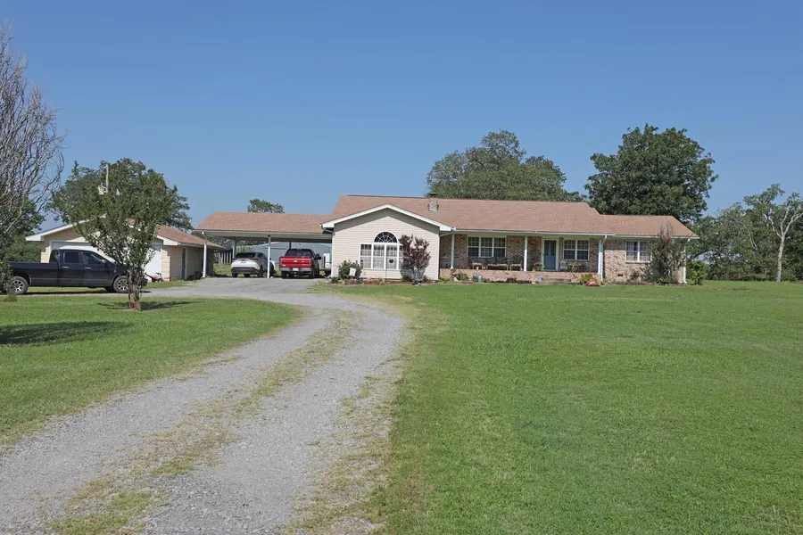 The ranch features a brick home with about 3400 sq. ft. of living space, barn/shop, metal working pens, garage, and large storage building.