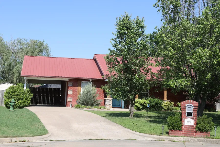 This is a beautifully maintained, brick home on a cul-de-sac lot! The home features three bedrooms, two full baths, kitchen/dining combination, with a large privacy fenced yard with a covered back patio and two decks for lots of outdoor living pleasure. There is also a long covered patio across the front of the house. This steel-frame home has six-inch exterior walls, a new central air unit installed in May, 2022, and a metal roof. Light neutral colors provide a nice ambiance. There is an atrium door walk out to the covered carport. Large shade trees on the west (front) of the house provide afternoon shade and a degree of privacy for the front patio. The kitchen features a free-standing electric stove, vent hood, microwave, and portable kitchen Island. The dining room has views into the back yard. There is already a utility storage building for lawn mower and other yard tools, in addition to a large shed that could be used for many purposes whether craft room, additional storage, workshop, etc. It features a covered porch, windows, and the interior has a loft on one end. Located on a paved city street with comparably nice residences, and just minutes to medical services, schools, and shopping.
