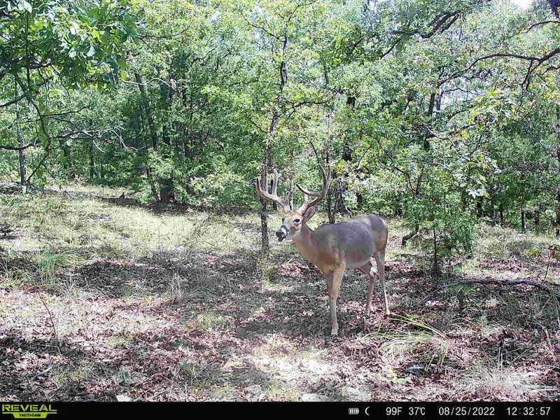 This property is full of mature hardwoods and various oaks, several small wet weather creeks and rainwater drainages and has plenty of road frontage. The terrain on the property is hilly on the East boundary but as you hike your way to the West the property levels off with an amazing elevated view as far as you can see. While the topography on the east side looks steep it is very manageable as you hit several oak flats or saddles that level off as you progress your way approximately 200' to the top.