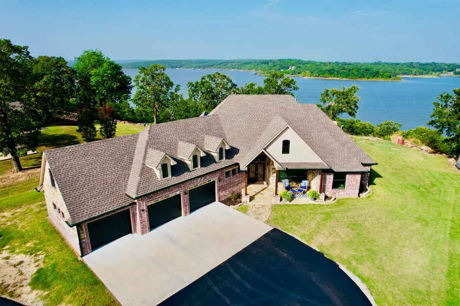 Home: This custom home sitting lakefront on the pristine waters of Lake Eufaula is the last place you will need to call home. This home built in 2023 has over 3,000 square ft of living with 3 bedrooms downstairs, which includes a large master suite with large walk in closets, stand alone tub and views of the lake. The commercial grade kitchen with large island and pantry opens up to a great room with vaulted ceilings, fireplace, automatic blinds and breathtaking views of the lake. Home also has home office, formal dining and a large bonus room on the second floor. The outdoor covered patio faces the lake, has a large sitting area and outdoor fireplace to enjoy those fall evenings viewing the fall colors that Lake Eufaula is known for. Property also features new asphalt driveway connecting to street that was installed after photos!