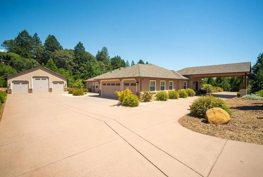 One-story Mediterranean style custom home with casita boasting a total of 4029 square feet of living space! Home is situated in the exclusive Walnut Orchard sub-division. Featuring triple zone heating and air, two tankless water heaters, Fiber Optic Internet, Cat 6 wiring and whole house sound wiring throughout and a whole house fan. Huge circular driveway through Porte Cochere at front. Entrance is slate, other flooring is hardwood, slate, tile and carpet. Great room and dining room share a double sided fireplace. Bar area comes with Hickory Cabinets as does the kitchen and baths. Kitchen has a full suite of stainless steel GE Monogram appliances including double convection ovens and 6 burner gas range w/griddle. Home and shop each have 200 Amp electrical panels. 1000 gallon owned in ground'' propane tank comes with home. Solar system is leased but paid in full and does about 14.5 mega-watt hours yearly. Shop has huge exhaust fan, a full bath and wash tub plus a propane heater.