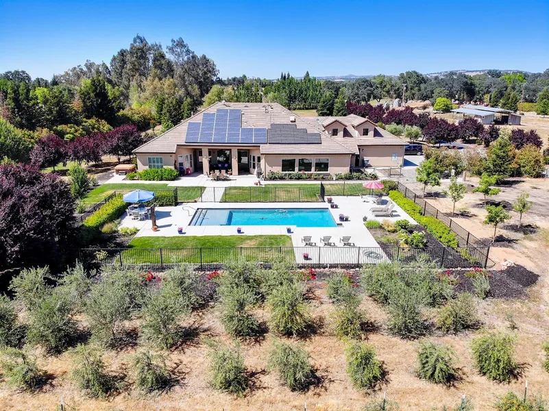 Wonderful custom home on beautiful level 5 acres features 4 spacious bedrooms include 2 guest suites, master suite & 4th bedroom being used as home office, 3.5 baths, gourmet kitchen features savage cabinets & is open to large breakfast nook & family room that overlooks rose garden & pool with lots of entertaining areas, expansive living & dining room opens to covered patio that overlooks pool, large front entry with covered patio overlooks front garden area & 18ft deep pond with dock, incredible 6 c garage is 1768 sq ft & includes room plumbed for wine cellar. All of this is one level, easy living PLUS unfinished 500 sq ft upstairs currently used for storage. Plenty of parking outside and a beautiful fruit orchard at back of property. Shared driveway is gated and private entrance is lined with plum & crepe myrtle and features 2nd gated entry, 1 inch NID irrigates landscape, fruit orchar...