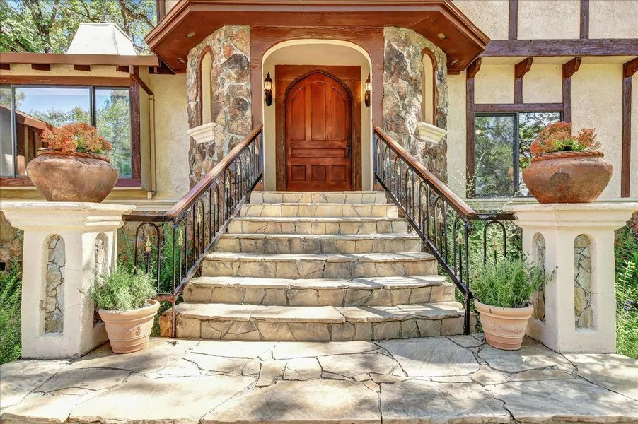 Reduced! MAKE OFFER! Majestic European-inspired Manor located on Private 5 ac park setting. Brick gated Entry, Sunny meadows, room for a barn/horses, pool or shop. Magnificent Victorian bronze fountain in center of wading pool. Gazebo patio w/ gas fire pit/table & Craft shed. Lawns/flower beds w/computerized sprinkler system. Enter the Solid mahogany Tudor style door & marble floor w/ handcrafted & carved 2-story bannister. Mahogany throughout is custom crafted: The cabinetry, 18 five-panel doors & wainscoting make this castle-like manor truly unique. New mahogany flooring. Newly Updated baths & kitchen. Large sunny parlor overlooks fountain area. Huge beamed great room w/ English-style paneling highlighted by a real stone fireplace; large wet bar. Attached spa room & spa bath w/ shower. 1000-sf. of wrap-around new decking. Entertainer's kitchen, new stove top, oven & microwave. Large attached Guest quarters. Close to Lake, Golf Courses & Award winning Schools. Lake of the Pines membership available!