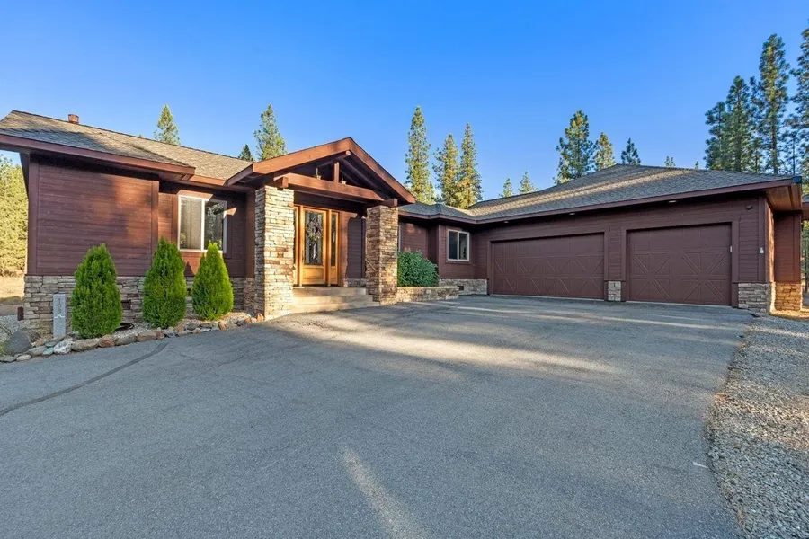 Mountain Retreat with Exceptional Garage Space & Trails at Your Back Door. Discover this beautifully crafted 3-bedroom, 2-bath home set on 1.15 level acres, perfectly blending comfort, functionality, and nature. Backing directly to the extensive Nakoma Resort trail system, the property offers instant access to miles of scenic hiking and biking paths, with a peaceful seasonal creek adding to the serene setting. The open-concept living area features vaulted, beam-accented ceilings, rich Brazilian hardwood flooring, and abundant natural light. The gourmet kitchen boasts granite countertops, custom wood cabinetry, stainless steel appliances, and pendant lighting over the island—perfect for both everyday living and entertaining. The oversized 6-car garage is a rare find, providing ample room for vehicles, recreational toys, and a workshop. Outdoors, enjoy low-maintenance landscaping with natural stone accents, a flat driveway, and plenty of usable yard space for gatherings or relaxation. Located in the heart of Nakoma Resort, you’ll have nearby access to resort amenities including golf, dining, fitness, and a year-round pool, all while enjoying the privacy of your own wooden retreat. Membership to Altitude Fitness Center sold separately.