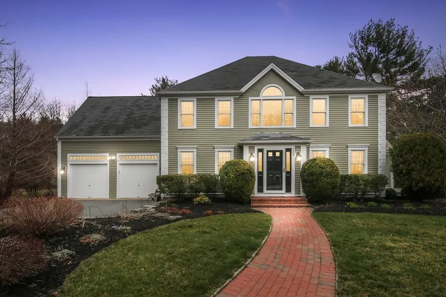 Elegant 4 bed Colonial set on 2.9 private, bucolic acres. Drenched in natural light throughout, hardwood floors in all bedrooms, living, dining, family room, hallways and foyer. Gorgeous views of nearby bogs from the family room's giant palladium window and beautifully detailed fireplace surround and mantel, cathedral ceiling, recessed lights. Enjoy the spacious living room with exterior access to a side deck. Off the welcoming foyer, you'll find the the dining room, doubling as an office, with butler hallway leading to the kitchen for easy entertaining. Eat-in kitchen has new stainless appliances, sliders to 2nd large deck, access to mudroom with sink and two car garage. All four bedrooms are large, with the master enjoying two walk-in closets, a built in window seat with bookcases and drawers. 2nd floor laundry. High end Buderus Boiler & water heater, 2 year old septic, most of interior and exterior just painted. New Carrier central a/c including new duct work. 5 minutes to route 3!