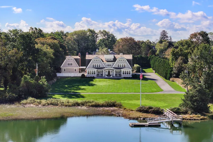 A majestic setting with picturesque scenic harbor views and direct water access, this stunning waterfront estate embodies the pinnacle of New England coastal living. This newly built "Nantucket-inspired" property showcases meticulous craftsmanship and contemporary elegance. The main house features 6 ensuite bedrooms, 3 half baths, and sprawling manicured grounds with an Australian Open surface tennis court. A beautiful patio connects to a heated 40 X 20 ft pool, providing both recreation and relaxation. The property further delights with a charming 1,350 SqFt 2 bed, 2.5 bath Guest House with kitchenette, laundry, and an indoor/outdoor fireplace. With captivating water views, this home seamlessly blends natural beauty with modern luxury. Enjoy easy waterway access to protected Duxbury Bay w/ a private dock and mooring. Additional amenities: geothermal home, 6 bed bunk room, top floor family room/office, gym + yoga studio, additional laundry and half bathroom in the oversized garage.