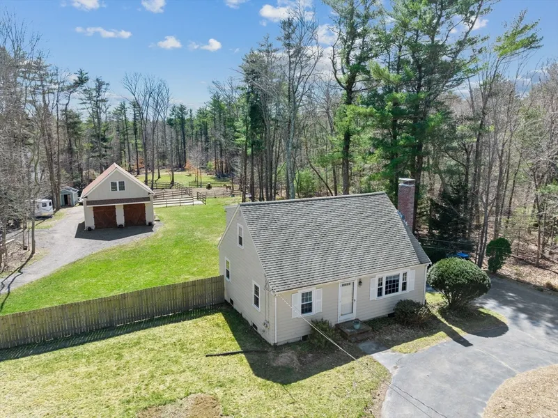 The beauty of rural living with the convenience of the South Shore. This amazing property, equipped for your equestrian lifestyle, begins with a charming 1950's home: Farmhouse details, open kitchen/living space w/ wood stove, Office & Playroom on 1st level w/ closets, 3 bedrooms up including front to back primary. Full bath on both levels. 8 yr old 5 Bed septic. 28x30 Garage built in 2020; heated, fully insulated, two huge bays, partially finished space upstairs, custom doors-perfect for cars, equipment, workshop, or hobbyists. The outdoor spaces are an extension of the home's charm with stone walls, small pond-your own homestead on over three private acres! For your horses or other livestock there is a 12x40 Horse Barn with Running Water, Electricity, Hay Shed, 2 run in Stalls (room for 2 more), Tack area, 1 Acre of Fenced in Pasture, 1/2 Acre of Dry Paddocks. Garden Shed, Full Privacy Fencing with 13' Double Gate. Miles of nearby trails. A rare gem with unlimited outdoor fun!