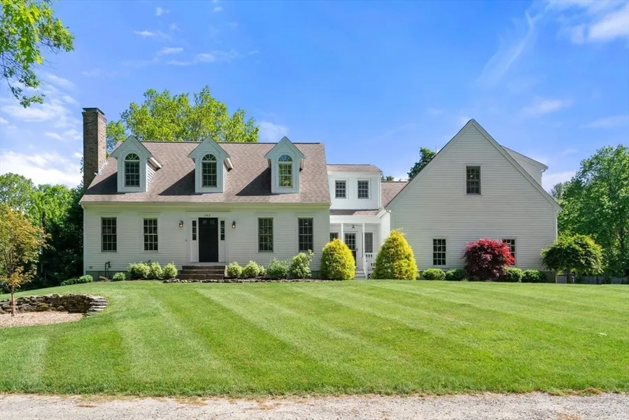 This pristine 4BR, 3.5BA Cape is set on a beautifully landscaped, private corner lot filled with abundant natural light. Renovated in 2022, the kitchen and bathrooms are tastefully updated and modernized. The kitchen boasts a Viking 6-burner cooktop and hood, Viking fridge, Thermador wall oven, Bosch dishwasher, large pantry, and both center and peninsula islands. The open layout flows into a cozy living room with fireplace, hardwood floors, and French doors. The stunning primary suite features dual closets and a spacious, renovated bathroom. Above the 2-car garage, a private ADU with its own separate entrance offers a bedroom, office/living area, full bath, and kitchenette-ideal for guests or rental opportunity. Additional highlights: finished basement, generator hookup, irrigation, oversized 1st-floor laundry, new siding, and a large deck overlooking the professionally landscaped yard. Convenient location to restaurants, shops and commuting.