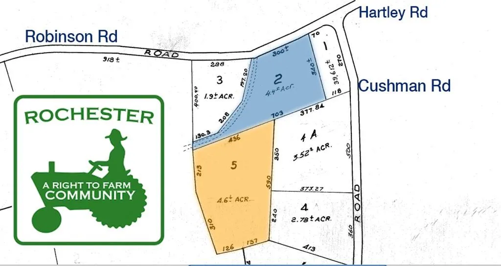 9 ACRES offered in the beautiful town of Rochester. Acreage consists of 2 parcels: Lot 2 has 4.4 Acres and Lot 5 has 4.6 Acres for a total of 9 Acres combined. A wonderful opportunity to buy into the lovely town of Rochester. No current engineering done. Buyer and Buyer agents to perform all due diligence. Land is getting scarcer and scarcer, well worth the effort to see if this could be the location for your new home. MAP 36: LOT 2 & LOT 5