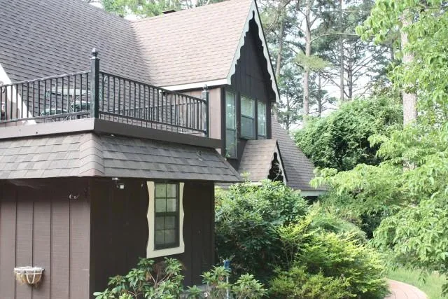 #1587 ~ CHARMING A-FRAME CHALET overlooking a pond and woods. Or look out the sun room to the in ground pool with gazebo, rod iron fence and coy pond with water fall.. Enter the front to a formal Living Room with cathedral ceiling, rock fireplace and a loft over the dining area. The kitchen has a bar and eat in area. There is a family room with a rock fireplace and patio doors to hot tub. French doors lead to the game room with cathedral ceiling and French doors to patio with water fountain. 2 large bedrooms down stairs each with their own bath. 2 bedrooms, bath,& loft upstairs. Private 5 acres close to town. Rock pillars on attached carport and storage units. $290,000
