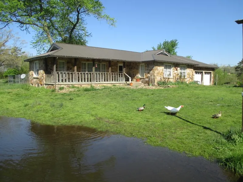 Wonderful 4 acre lake on this property! The home is at the end of the lane of these 17 acres, with the lake being at the edge of the yard. The 3bdr/1 bath Rock home has wood floors and lots of built in storage cabinets. Kitchen has updated appliances and a pantry. Enclosed back porch and two car garage and a neat front porch. Metal carport and outbuilding. Small stock pond in fenced pasture.