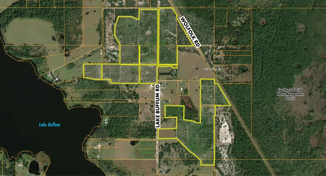Excellent ridge soil land with 1/2 mile of hard road frontage. Property is in two groupings on either side of Lake Buffum Rd. Current owner is in the process of platting the entire property into large residential lots ranging in size from 5 to 15 acres each. A new owner can continue the on-going project to completion and sell the individual lots for an excellent return. This site represents an attractive investment opportunity in rapidly growing eastern Polk County.