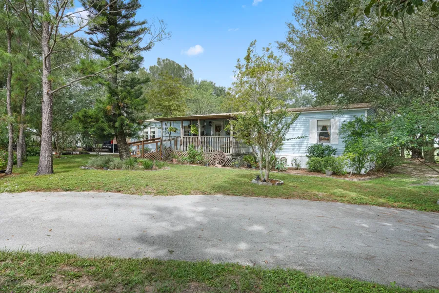 Situated on a generous 1.44-acre lot, you'll find this Charming 3 Bedroom/2 Bath Manufactured Home. This cozy abode boasts a spacious family room adorned with a stone-front wood-burning fireplace. French doors from this room lead onto the back porch, inviting you to sit and immerse yourself in the soothing sounds of nature. The kitchen is practical and well-equipped, featuring plenty of cabinetry for storage. It flows seamlessly into the dining room, making entertaining a breeze. The master bedroom suite offers a walk-in closet and an ensuite bath for your convenience. Throughout the home, you'll appreciate the vaulted ceilings, which add an open and airy feel. For added privacy and versatility, there's a formal living room that provides ample space for each family member's personal needs. Additional amenities include an updated AC unit and a durable metal roof. The home also comes with a laundry room complete with a washer and dryer, a water filtration system, and two storage sheds for your convenience. The home is handicapped accessible with a ramp. Both front and back porches provide great spots to enjoy the outdoors, and there's even a deck with an awning for shade. The fenced-in yard features a gated entrance, ensuring security and privacy. With two paved driveways, there's enough parking space for an RV and a boat, as well as a carport for additional covered parking. A glass front storm door adds a touch of elegance to the entrance. This property is truly a gem, set on a picturesque wooded lot surrounded by lush gardens and foliage, providing tranquility and privacy. Its great location offers a short commute to shopping, restaurants, and even the excitement of Legoland. Whether you're looking for a peaceful retreat or a convenient home, this property offers the best of both worlds.