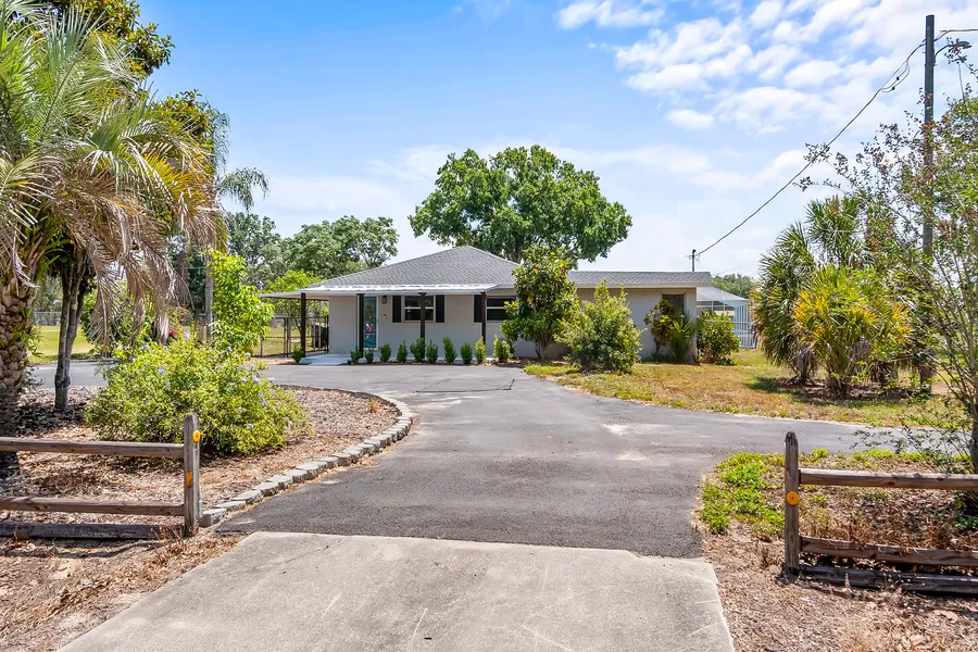 One or more photo(s) has been virtually staged. Do you want space and privacy? Beautiful updated pool home on three acres all high and dry. No HOA. All the big items are new or newer. New roof 2024, air-conditioning units in 2019 and 2023, water heater in 2021, septic system in 2022, vinyl plank flooring in 2021 and exterior paint in 2021. Make this fabulous oasis your new home. The kitchen is lovely with tons of cabinet space, stainless steel appliances, double ovens, under cabinet lighting, glass cooktop and exhaust fan. Plenty of room for the chef to cook and entertain the whole family. The living and dining area is oversized with surround-sound speakers and wiring in place. Just need to put up your flat screen TV and you are game or movie-night-ready! Four big bedrooms all with luxury vinyl plank flooring, ceiling fans and ample closet space. Both baths have been updated for you. There is a huge laundry room. Tons of space for a folding table and ironing board or make it into a large dressing room. There is also a bonus utility room in the center of the home, great for storage or a safe room. The exterior of the home has endless possibilities. A covered front and back porch. A huge screen enclosure with a pool for cooling off on those hot summer days. What a fabulous entertaining area. The yard is enormous. With three fenced-in acres all your animals will be free to roam around and explore. Keep your lawn equipment and pool toys in the three sheds that are on the property. The extra-large driveway has just been resealed. Tons of parking for everyone including a covered carport attached to the home. All this and only 30 minutes to Disney World. You feel like you are out in the quiet country but you are only three miles from Publix and restaurants. Also, you are just three miles from Interstate 4. See this amazing sanctuary and make your new forever home.