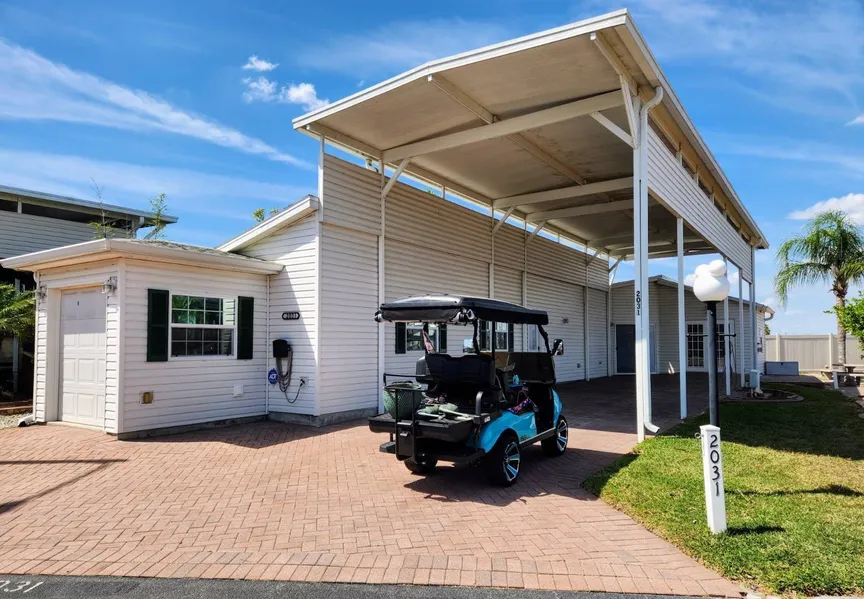PRICE REDUCTION!!! Contact listing agent to tour quickly. This home will be sought-after as seasonal rental residents return. The roomy port home is truly move-in ready. There's not a single flaw; pleasing finishes, and it is being offered fully furnished! Perfect for seasonal RVers or full-timers; 2031 St George Drive features two full bathrooms, a large open kitchen/dining/great room, room bedroom with pass-through closets and ensuite primary bathroom, guest bathroom with washer/dryer, attached cart garage, attached workshop/shed and a huge 65' port. The exterior of the home is nicely finished in white vinyl siding with black shutters. The entire site is paved with brick pavers. Two entrances lead into the home from the port; a large center glass door and a slider door with built-in blinds. The kitchen features Samsung appliances, loads of cabinet space, and a walk-in pantry. A tidy dining table with fold-down sides completes the kitchen. A large Samsung smart TV anchors the great room, across from an operable loveseat with cup holders & storage. Two right-sized recliners complete the great room. Off the hallway to the right is a roomy full guest bath with stackable Frigidaire washer/dryer and step in corner shower. The master bedroom is at the front end of the home. It is roomy with even with a king-size bed, two nightstands, a dresser and another TV. The primary closet is a pass-through. The primary bath has a roomy step-in beautifully tiled shower and quartz topped vanity. A pleasing laminate floor is featured in the primary bedroom and hallway. The bathrooms and great room are finished in ceramic tile. This home has the ever-so-rare double duo; an attached cart garage with operable door and a separate attached shed/workshop. The site is nicely landscaped and has irrigation. The huge port provides plenty of shade for your class A RV, as well as you tow-behind vehicle and the requisite golf cart. At the current price of aluminum, the port alone is valued at $80k+. Perhaps best of all is the location. The home is across from hole 7 of the stunning Deer Creek Golf & Tennis RV Resort in Regal Pointe, one of six communities within Deer Creek. Regal Pointe is the luxury class A section of Deer Creek; if you have an RV it must be a class A (bus type) RV. Deer Creek is a golf cart friendly community and offers many activities and amenities, including a large community pool, hot tub, tennis, pickle ball and shuffleboard courts, tiki bar, and the signature 18-hole executive golf course. Deer Creek has an activities director who coordinates all types of activities and events from cruises to day trips to concerts, card games, water volleyball, numerous golf scrambles, etc. Regal Pointe, has its own pool & hot tub and clubhouse with a large community room, workout facility (the only one in Deer Creek, laundry center and men's/ladies' locker rooms. The community is well-situated with easy access to banks, shopping, restaurants and more. The Orlando international airport, the VA hospital and the area theme parks are also within a 20-40 minute drive. Call to make an appointment to tour this gorgeous property.
