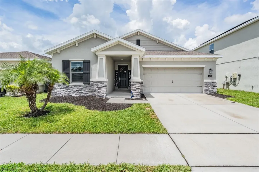 Welcome to 507 Patton Loop, where charm meets smart living in the heart of Liberty Ridge. This Lennar NEXTGEN home offers an attached in-law suite with its own laundry, kitchenette, and garage access! Perfect for accommodating family, guests, or passive rental income. Built in 2021, this thoughtfully designed 3-bedroom, 3-bath home isn’t just move-in ready—it’s live-in-and-love-it ready! Pull into the driveway, admire the tastefully manicured landscaping, and you’ll instantly feel the pride of ownership. The covered front porch invites you to slow down and stay awhile. Inside, the open layout is filled with natural light and high ceilings. The kitchen shines with stone countertops, stainless steel appliances, and plenty of space to gather. The luxurious primary suite offers privacy and comfort with a spacious bathroom and ample storage. Modern living is made easy with smart home features, double-pane windows, and solar panels that keep energy bills in check! The fenced backyard features a screened in and covered patio, making the space ready for pets, play, or your personal touch. Additionally, the home is conveniently located just minutes from the new Polk Parkway extension which will allow for an easy commute to Tampa or Olando. This community offers a low HOA and NO CDD, giving you the community feel at an affordable price. If you’re looking for something that just feels right—stylish, practical, and welcoming—you’ll want to see this one in person! Ask about the low assumable VA rate and schedule your showing today!