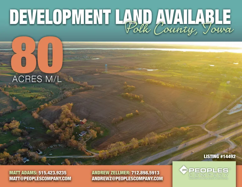 Offering 80 acres m/l (to be surveyed) of transitional development land located on the north side of US Hwy 141 between Granger, Iowa and Johnston, Iowa. Property is adjacent to the Granger city limits which would allow for routine annexation into the city. Utilities are located at or nearby the site with potential for sewer to gravity flow to the recently installed pump station on the southeast corner of the Twin Eagles Point Subdivision west of this property. Water would be provided by the City of Granger.