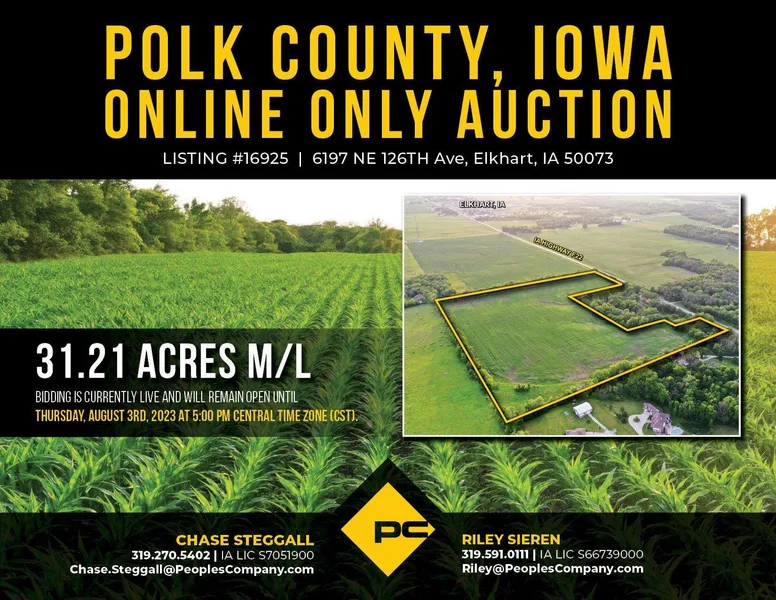 Polk County, Iowa Online Only Auction Mark your calendar for Thursday, August 3rd, 2023!Have you been searching for a perfect building site or high-quality farmland tract? Peoples Company is pleased to present 31.21 acres m/l located in Polk County, IA just east of Elkhart. Located 15 minutes from Ankeny, 25 minutes from downtown Des Moines & 30 minutes from Ames, IA, this property is sitting arguably in one of the most sought-after locations in Iowa.