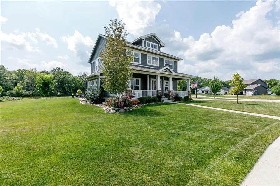 With over 3,700 sq. ft. of finished living space, there is plenty of room to spread out in this gorgeous farmhouse style home. The main floor has a home office, dining room, and spacious living area with beautiful stone fireplace that is completely open to the kitchen, complete with all stainless steel appliances (all stay) and custom cabinetry with ample storage. There is also a large mudroom/drop zone right off of the garage entrance, as well as a half bath. Upstairs you will find a convenient laundry room with storage and folding counter, a full bath, and 4 sizable bedrooms. One of the secondary bedrooms has it?s own bathroom and walk-in closet. The huge owner?s suite includes a soaker tub, tile shower, separate vanities, and large walk-in closet. You will find a 5th bedroom in the finished basement, along with another bathroom, recreation room/den, and bar area (refrigerator stays), in addition to tons of storage space. Whether you want to enjoy your morning coffee on the huge front porch or, or step around back to an evening bbq, the outdoor features on this .628 acre corner lot complete with sprinkling system are endless! Covered composite deck, built-in stone bench seating and grill area, and a generous sized patio make entertaining a breeze. This great Polk City location puts you close to trails, Saylorville Lake, Big Creek and Jester Park, and TCI Golf Course. Schedule your showing today!