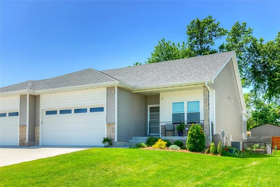 Charming, updated, ranch bi-attached home featuring an inviting, open style floor plan with a spacious living area and kitchen. Beautiful 4 season sunroom just off the kitchen area, offering lots of extra natural lighting. 2 bedrooms on main floor with 2 full baths and 1 bedroom & 1 full bath on lower level. Kitchen features quartz countertops throughout, as well as a nice sized walk in pantry with wire shelving. Flex room in front of house has potential for an office, work out room, play room, etc. Back yard is beautifully landscaped and would make a great entertaining space. Storage space under the sunroom for mower, etc. Open, spacious living area in basement. Generous storage space off of it! Hunter Douglas window coverings throughout main level. Aquasana Home Water System. Active radon system. Leafguard gutter coverings. Conveniently located in the heart of Grimes in a quiet neighborhood, with easy access to Hwy. 141. Close to lots of local amenities, including the Dallas Center-Grimes Schools. Investor friendly. No HOA or fees. A must see!