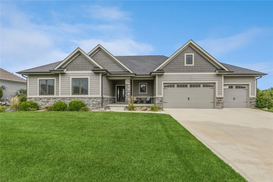 In the St. James neighborhood on the north side of Ankeny, you will find stunning views of the 48 acres of natural prairie surrounding the prestigious Saint James Development. This 5-bedroom walk-out ranch home, located in a peaceful cul-de-sac, offers substantial privacy on a premium 0.485-acre lot in this one-of-a-kind development. With over 3,200 finished square feet, this home is both spacious and inviting. An inviting entry leads to an impressive great room featuring a tray ceiling, a stone-faced fireplace, and built-ins. The kitchen is sure to impress, with granite counters, beautiful custom cabinets trimmed with crown molding, and a center island snack bar. Enjoy your morning coffee on the large 12' x 15' deck while listening to the sounds of the prairie and creek. The primary ensuite offers great views, a raised tray ceiling, a walk-in closet, double sinks, and a tiled shower. The main level also includes a dining room, a mudroom with built-ins, a laundry room, two additional bedrooms, and a full bathroom. An open staircase leads to a walk-out lower level with two large bedrooms, a full bathroom, a bonus room, and ample storage. The lower level also features a large family room with a wet bar and a wine chiller. The irrigated yard is perfect for gatherings with friends and family. The heated three-car garage includes an extra deep third stall for all your toys. Schedule a showing today!