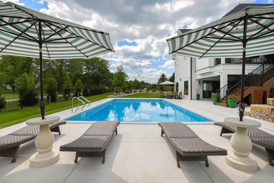 Casually sophisticated architecture in exclusive Carmel Park awaits! Covered entry leads to an attractive foyer, guiding you to the living room that bathes in natural light with relaxing ambiance. A stunning primary suite feat. vaulted ceiling, his & her vanities, herringbone tile, and impressive closet. Connected laundry room adds convenience. A second bedroom suite with full bath offers guest space. The office, positioned at the front of the home, boasts natural light, a moody vibe, and built-in bookshelves. Kitchen impresses with timeless cabinetry and classic atmosphere; the walk-in pantry may become your favorite room of the house with an ice maker, wall oven, and refrigerator, plus room for all those small appliances. Main living room, with vaulted, beamed ceiling, feat sliding glass wall for alfresco living. Outdoor living shines with heated, covered porch w/ phantom screens and kitchen with gas grill. Lower level adds luxury with bar, wine cellar, family room with fireplace, and theater room featuring Dolby Surround 7.1. Two additional en suite bedrooms and gym complete this level. Outside, find an oasis with 20x40 saltwater pool, landscaped yard, and pond views. 4-car, 1762sf heated garage is a dream. Mudroom and drop zone area with adjacent closet offer unexpected convenience. No detail spared - security, reverse osmosis, geothermal heating/cooling, permanent outdoor holiday lighting, SONOS, and automatic shades throughout. Ask for detailed upgrade list!