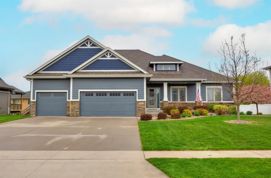 Thoughtfully updated and perfectly located near Four Mile Creek, parks, golf, and interstate access, this stunning home offers the ideal blend of function and flair. Fresh exterior paint (2023) and an expanded deck set the tone for inviting indoor-outdoor living. Inside, soaring vaulted ceilings and a cozy gas fireplace anchor the main-level living space, complemented by brand-new carpet. The kitchen is a chefs dream with granite countertops, a walk-in pantry, espresso cabinetry with crown molding, and a charming sink-side window. Two main-level bedrooms share a Jack & Jill bath, while the primary suite is a private retreat featuring a tray ceiling, wainscoting, and a spa-like bath with a tiled shower, soaking tub, and a huge walk-in closet. A main-level office, laundry room with lockers, and half bath add everyday convenience. The finished lower level impresses with a massive rec room, built-ins, an electric fireplace with blower, a fourth bedroom, and an entertainers wet bar with full-size refrigerator and wine fridgeall illuminated by daylight windows. Extras include irrigation, water softener, and an oversized garage.