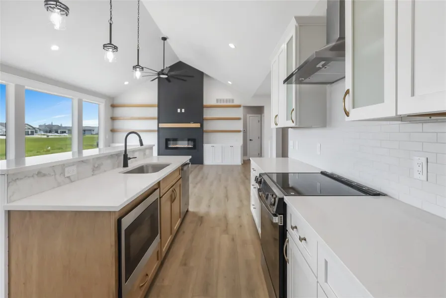 Builder Bonus! Receive a $5,000 credit at closing-use it toward upgrades, closing costs, or buying down your interest rate. Welcome to your dream home: a stunning luxury new construction ranch that blends modern sophistication with thoughtful functionality. This exquisite residence features a spacious 3-car garage and a covered back porch perfect for relaxing or entertaining. Inside, an open-concept layout unites the living, dining, and kitchen areas-adorned with sleek finishes, high-end materials, and a striking electric fireplace centerpiece. The master suite is a retreat with custom wall designs, a spa-like en suite, and a massive walk-in closet with built-ins. The main level includes two more bedrooms, a second full bath, and a mudroom with custom shelving and laundry room access. The fully finished basement adds two bedrooms, a full bath, and a large living area with countertop space and built-in water/sewer lines-ideal for a future wet bar. A dramatic blacked-out home theater and wine cellar shelving complete this one-of-a-kind modern masterpiece.