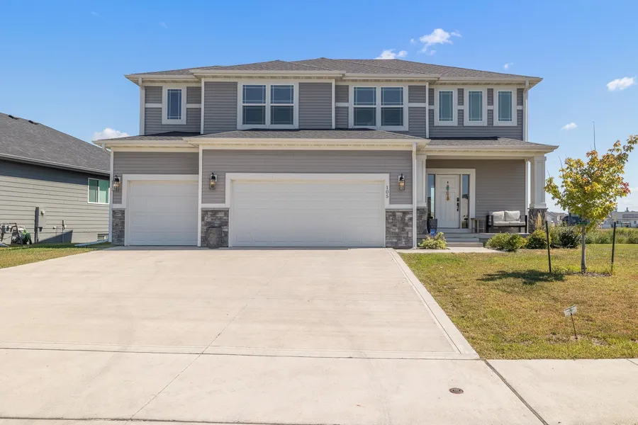 Elegant and modern, this 4-bedroom, 2.5-bathroom one-owner home (built 2022) sits on a full 0.36-acre lot with no rear neighbors. Boasting over 2,140 sq ft of living space, the open main level invites you in with a shaker-style island, quartz counters, soft-close cabinetry, and a stone-accented electric fireplace. Host effortlessly in the combined kitchen, dining, and living area that opens to a covered patio. Upstairs, the primary suite offers a dual-vanity bath and large walk-in closet, plus three additional bedrooms, upper-level laundry, and dual sinks in the shared bath. The unfinished basement-with egress window, pre-plumbed bath, and tall ceilings-awaits your finishing touches. Additional features: 3-car garage, low-cost HOA, and situated in the sought-after Bondurant-Farrar school district. All information obtained from seller and public records.