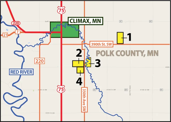 Driving Directions: From Climax, MN go south 1.25 miles on HWY 75 and then 1 mile east on 400th St SW. This will bring you to the corners of Parcels 2, 3, and 4. Proceed 1 mile east and then go north 1 mile on 340th Ave SW and then .5 miles on 390th St SW, this will bring you to the southwest corner of Parcel 1.