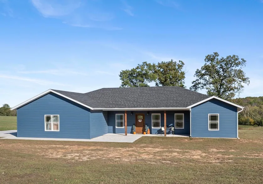 Welcome to Hidden Hills Subdivision, Peaceful, Country Living with a Gated Entry! This custom-built 1,719 sq ft home sits on 15 Beautiful Acres with a, privacy, space, wet weather creek and scenic surroundings. Inside, you'll love the open-concept floor plan designed for both everyday living and entertaining. The heart of the home features a beautiful kitchen with custom cabinetry, quartz countertops and stainless appliances, walk-in pantry, dining area and a large living room with an electric fireplace that adds warmth and modern charm and plenty of windows with a backyard view. This 3-bedroom, 2-bath layout offers comfortable room sizes and thoughtful finishes throughout. The master suite was well thought out with master bath offering his and her sinks, soaker tub, shower, large master closet with laundry. Step outside and enjoy the views from both the covered front and back porches, perfect for morning coffee, evening sunsets, or simply taking in the quiet country setting. With ample acreage for recreation, and a few animals, this property offers the best of rural living without sacrificing quality or convenience. This home is very energy efficient, (Average 2025 utility bill is $172.00.) Located in the Bolivar School District, this one-of-a-kind property combines craftsmanship, land, and location an ideal place to call home.