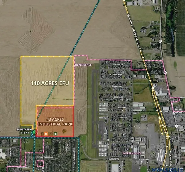 City of Independence "Enterprise Zone" development property. 43 acres Zoned IP - (Industrial Park), as well as 110 ac EFU farm ground. The City has expressed interest in considering ideas and strategies to support various types of development. Plenty of power to site. Utilities require off-site improvements. Independence is a vibrant, dynamic and livable city with a revitalized downtown, a very robust fiber-optic capacity, rail, a new City Hall and many riverfront arts and cultural opportunities.