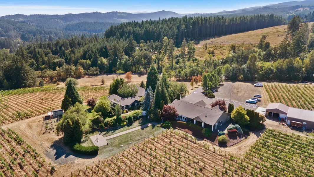 Exceptional Turn-Key Wedding & Event Venue with Vineyard. With a 25-year legacy, this growing wedding and event business offers a rare turn-key opportunity. The property showcases an event center (3,658 SF) with a bridal suite, catering kitchen, two restrooms, sound system, wood floors, and a stone fireplace; a private 2BD/2.5BA residence (2,493 SF) with office, studio/sunroom, renovated gourmet kitchen, vaulted wood ceilings, gas fireplace, large laundry, and oversized 2-car garage; and a charming 1BD/1BA cottage (993 SF) with office, spacious kitchen, gas fireplace, laundry, and private deck. The beautifully landscaped grounds feature mature plantings, sprinkler systems, an expansive event lawn with stone walkway, staging area, 400-amp power, and overhead string lighting—all set against stunning vineyard, Mt. Hood, and forested foothill views. Included outbuildings with power and concrete floors: GP Building (2,025 SF) and Machine Shed (900 SF). Centrally located in the coastal foothills just 18 miles west of Salem, with easy access to Portland and Eugene airports and under an hour to the Coast, the offering includes the established event/venue business (w/associated FF&E), and an option to purchase the farm equipment, recently established and gaining recognition wine label, and wine inventory. Request brochure for additional details – active business DO NOT DISTURB.